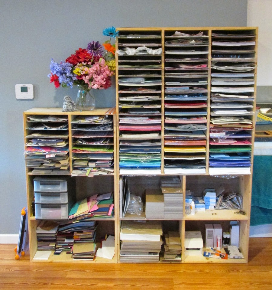 Directly behind my work table is the shelf my Uncle Dave built me. It holds all my scrapbook papers and some other supplies I use often as well.